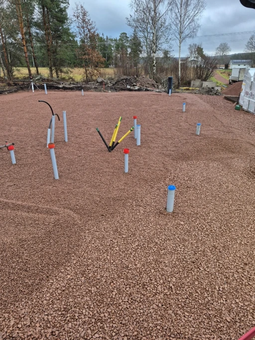 Vi schaktade bort ytjorden till fast underlag. Sedan levererade vi kapillärbrytande gruslager av 16-32 mm. Planering och utförande av VA samt infiltrationsbädd. Därefter leverans av ytjord och forma grunden till det som ska bli deras trädgård.
